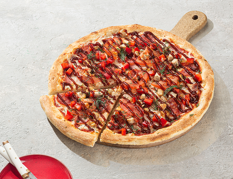 Сыр моцарелла, бекон, пепперони, болгарский перчик, свежие томаты, свинина, филе цыпленка, соус барбекю, зелень (30 см)